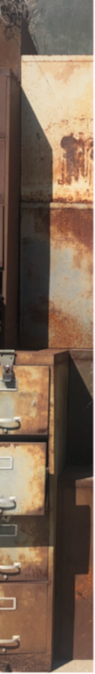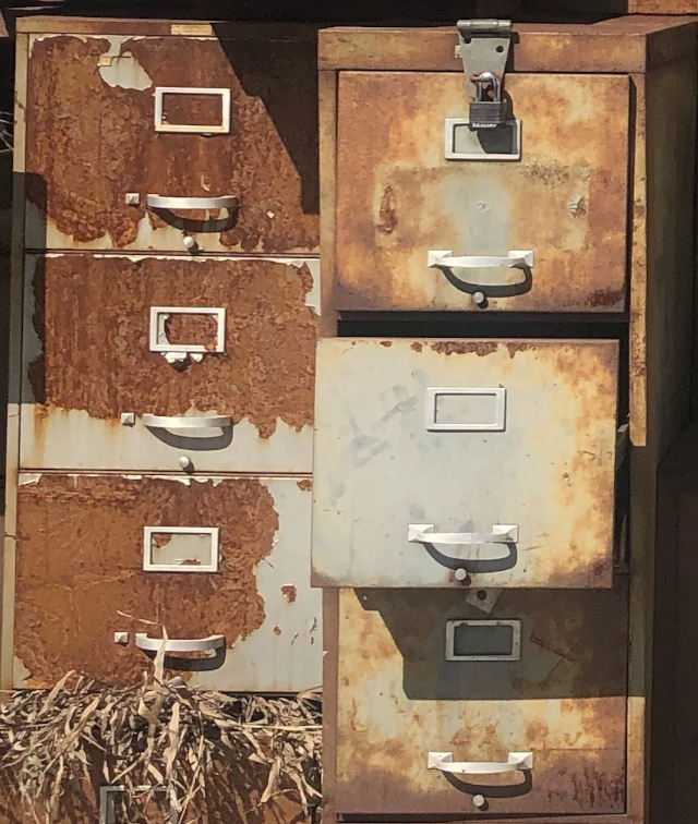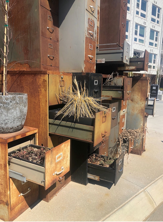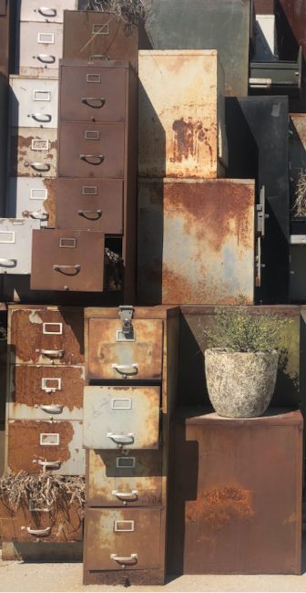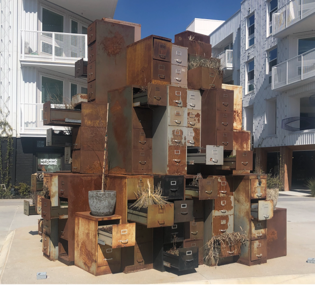 A sculpted tower of rusted filing cabinets sits at the entrance of Atlanta's Goat Farm Arts Center. The rust is surprising, alive, deep in corroding color, faint and bold patchwork patterns, uneven abundant shades of orange, brown, copper on the cabinets, themselves also surprising as they shoot up, suggesting a glorious plan that might have been, an absolute explosion of industry, now an assiduous archive rendered into obscurity, irretrievability, obsolescence, hubris.